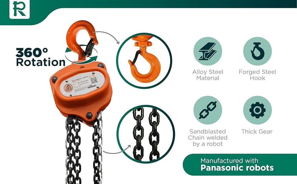 • Premium Build & Traceability: Features G80 corrosion-resistant chains, forged alloy steel hooks with 360° rotation, and robust steel latches. Each product includes a bilingual ID plate with a unique traceability code linked to a certificate.