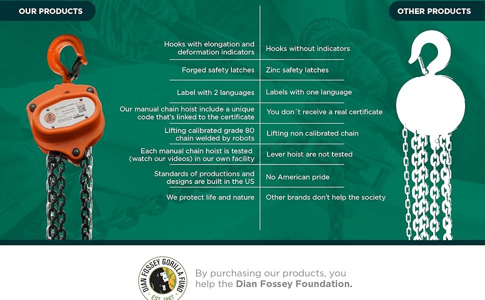 • Versatile & Community-Focused: Perfect for construction, warehouses, and confined spaces. Every purchase of our manual chain hoist supports the Dian Fossey Foundation, contributing to gorilla conservation and community development in Africa.