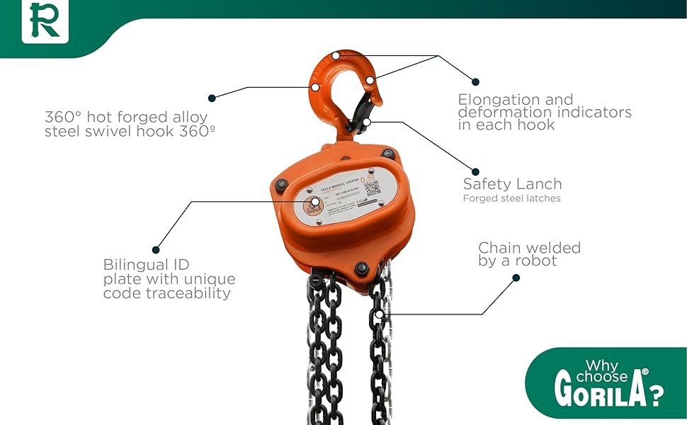 • High Load Capacity & American Pride: Safely handle heavy loads with GORILA’s compact, lightweigh manual chain hoist, designed for efficiency and ease of use in tight spaces and demanding operations. Crafted with pride, our design and manufacturing standards are established in the United States, ensuring unmatched quality and reliability.