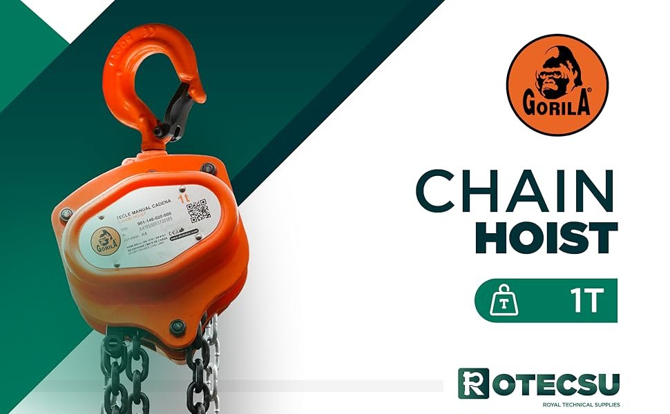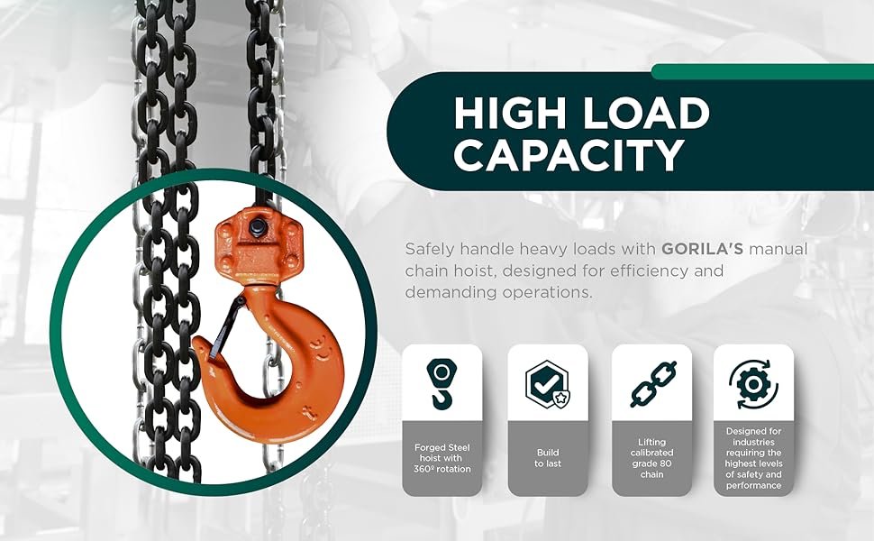 - High Load Capacity & American Pride: Safely handle heavy loads with GORILA’s compact, lightweigh manual chain hoist, designed for efficiency and ease of use in tight spaces and demanding operations. Crafted with pride, our design and manufacturing standards are established in the United States, ensuring unmatched quality and reliability.