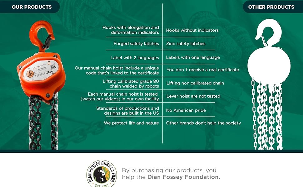 • Versatile & Community-Focused: Perfect for construction, warehouses, and confined spaces. Every purchase of our manual chain hoist supports the Dian Fossey Foundation, contributing to gorilla conservation and community development in Africa.