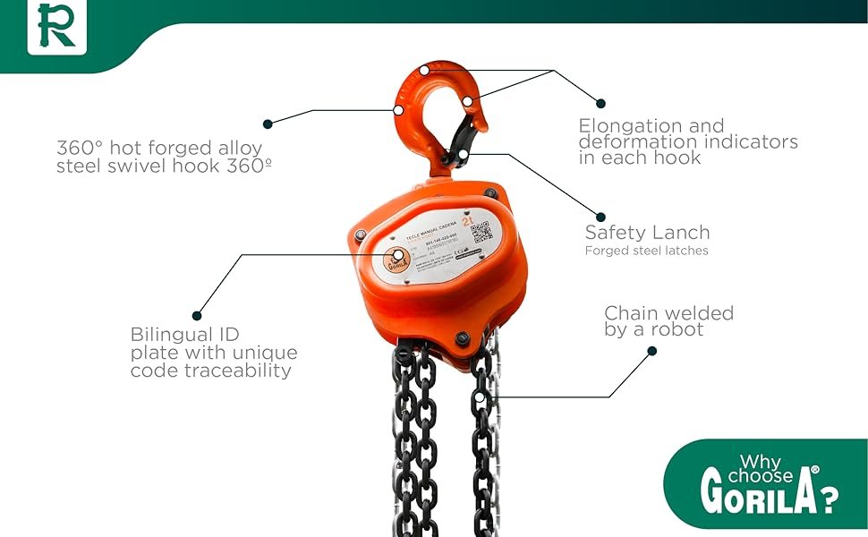 • High Load Capacity & American Pride: Safely handle heavy loads with GORILA’s compact, lightweigh manual chain hoist, designed for efficiency and ease of use in tight spaces and demanding operations. Crafted with pride, our design and manufacturing standards are established in the United States, ensuring unmatched quality and reliability.