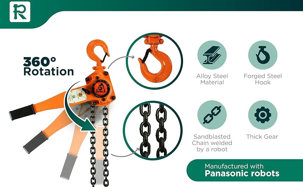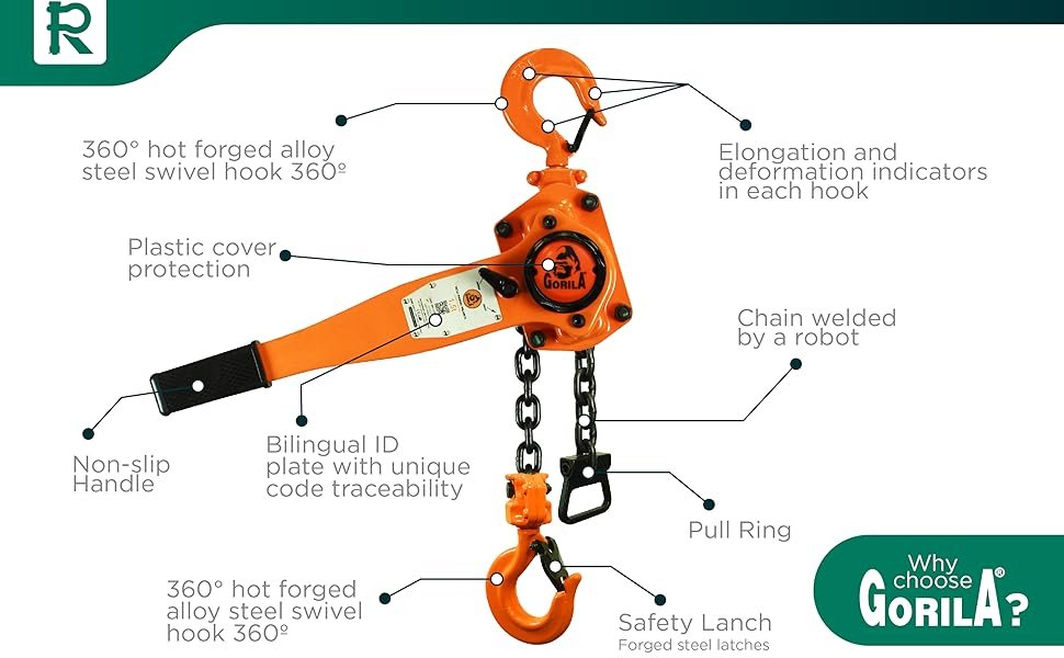 • High Load Capacity & American Pride: Safely handle heavy loads with GORILA’s compact, lightweight lever hoist, designed for efficiency and ease of use in tight spaces and demanding operations. Crafted with pride, our design and manufacturing standards are established in the United States, ensuring unmatched quality and reliability.