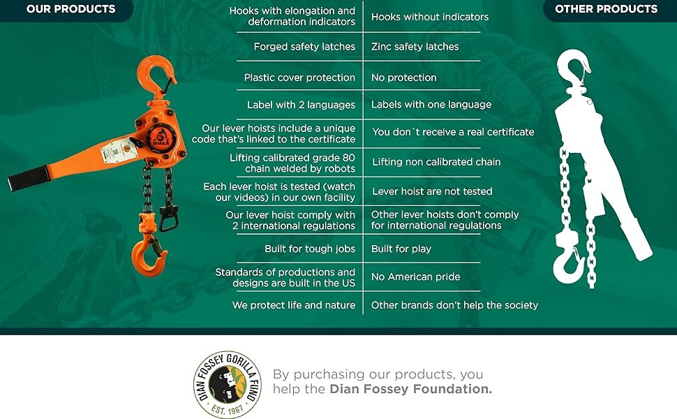 • Versatile & Community-Focused: Perfect for construction, warehouses, and confined spaces. Every purchase of our come along puller supports the Dian Fossey Foundation, contributing to gorilla conservation and community development in Africa.