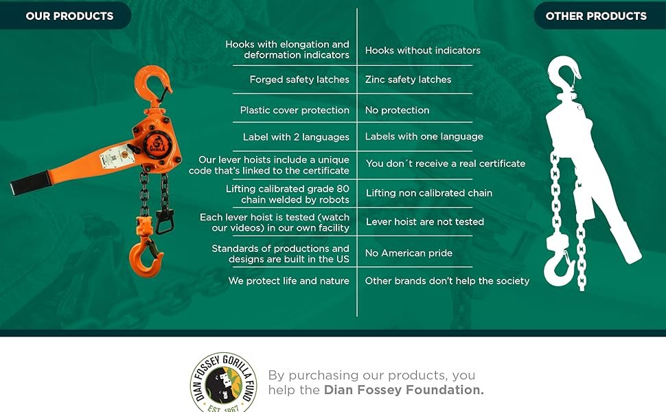 • Versatile & Community-Focused: Perfect for construction, warehouses, and confined spaces. Every purchase of our come along puller supports the Dian Fossey Foundation, contributing to gorilla conservation and community development in Africa.