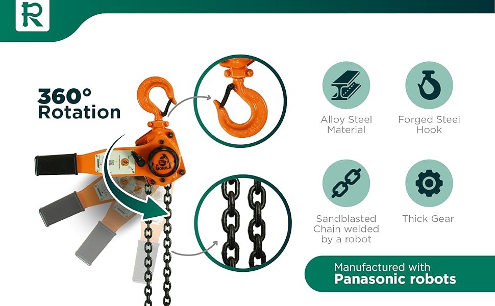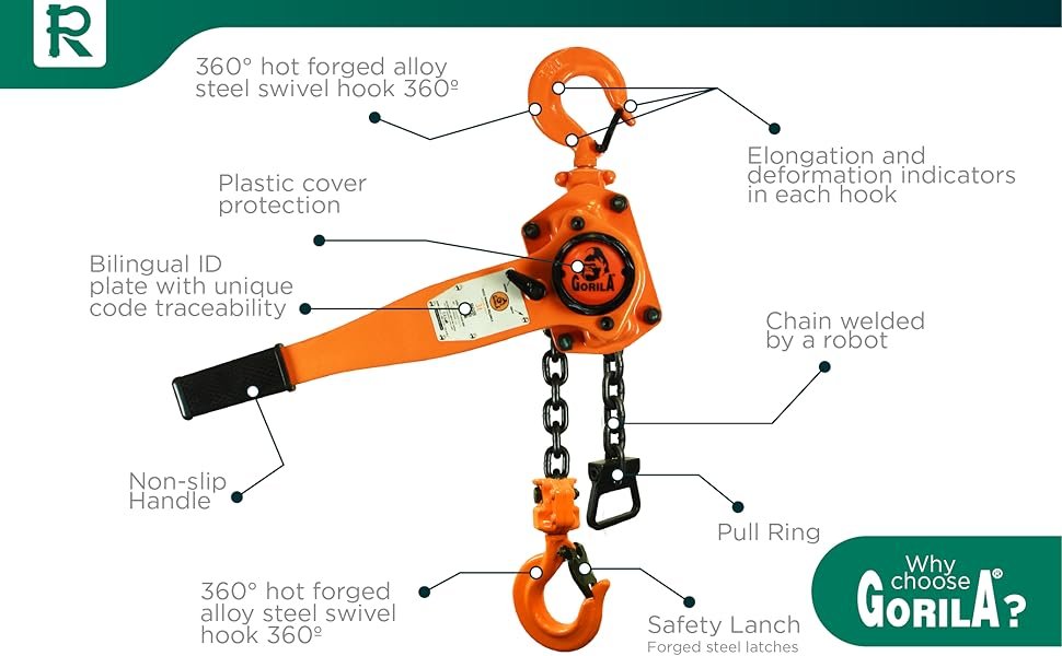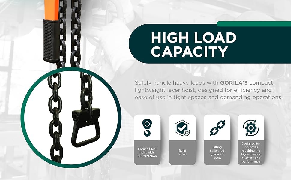 • High Load Capacity & American Pride: Safely handle heavy loads with GORILA’s compact, lightweight lever hoist, designed for efficiency and ease of use in tight spaces and demanding operations. Crafted with pride, our design and manufacturing standards are established in the United States, ensuring unmatched quality and reliability.